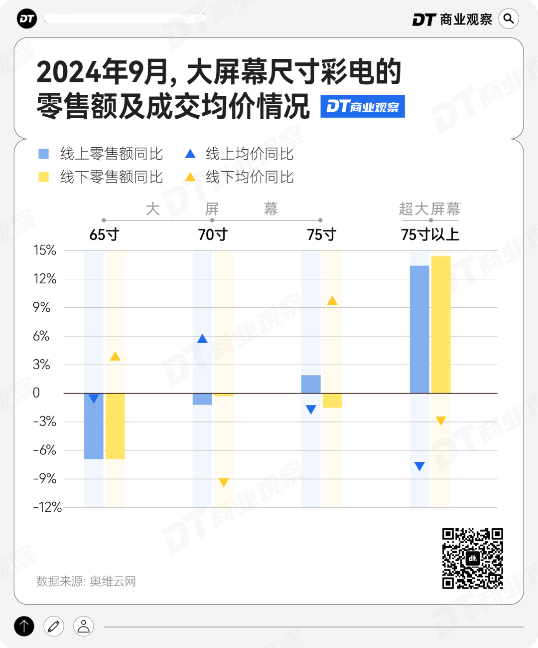 奥维云网的数据也指向了相似的趋势。以9月的销售情况为例,在线上,75英寸和75英寸以上的大电视的均价都比去年同期更低,但零售额同比去年都有提高,这意味着二者今年销量更好了。在线下,75寸以上的电视则更受欢迎。