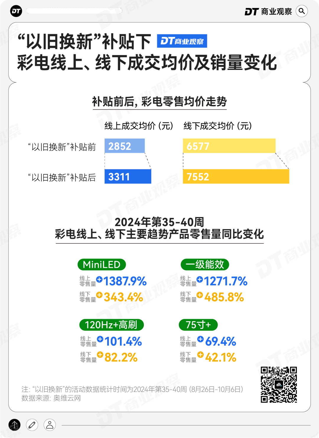 奥维云网对“以旧换新”补贴前后的彩电均价和销量情况做了统计,发现以MiniLED、120Hz+高刷、75寸为首的主流产品,同比销量蹭蹭往上涨。