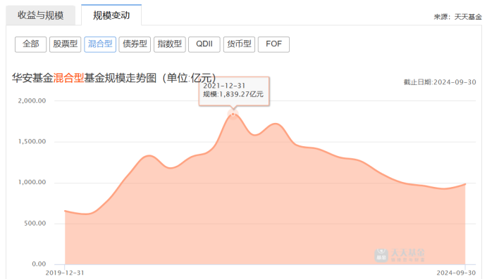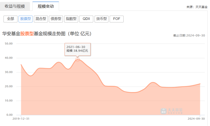 独角金融梳理发现,从2021年起,华安基金权益资产规模出现下滑,其中是混合类基金,下滑明显。