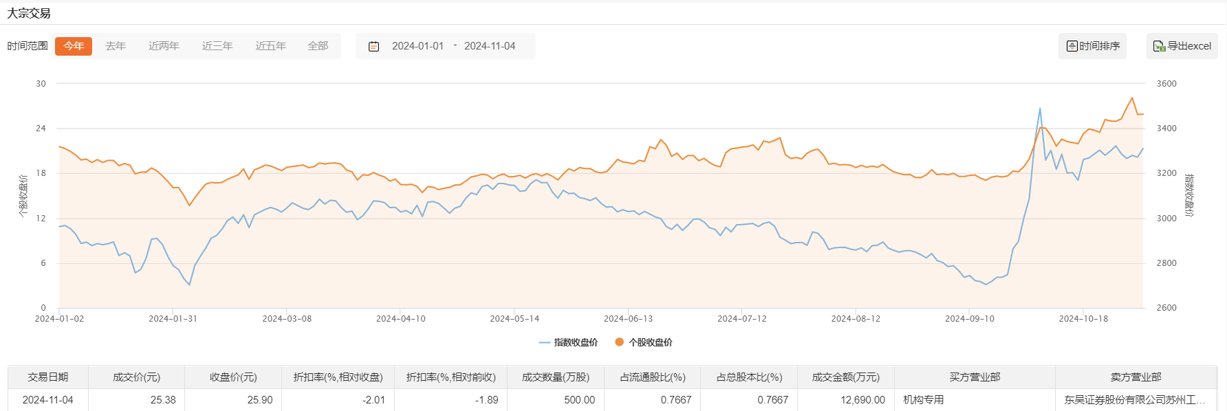 11月4日,晶方科技今日大宗交易成交500万股,成交额1.27亿元,占当日总成交额的8.12%,成交价25.38元,较市场收盘价折价2.01%。