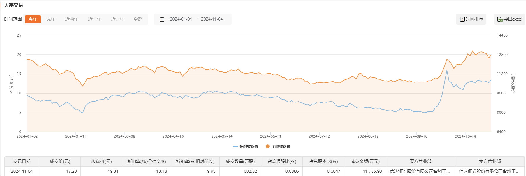 11月4日,航天彩虹今日大宗交易成交682.32万股,成交额1.17亿元,占当日总成交额的18.81%,成交价17.2元,较市场收盘价折价13.18%。