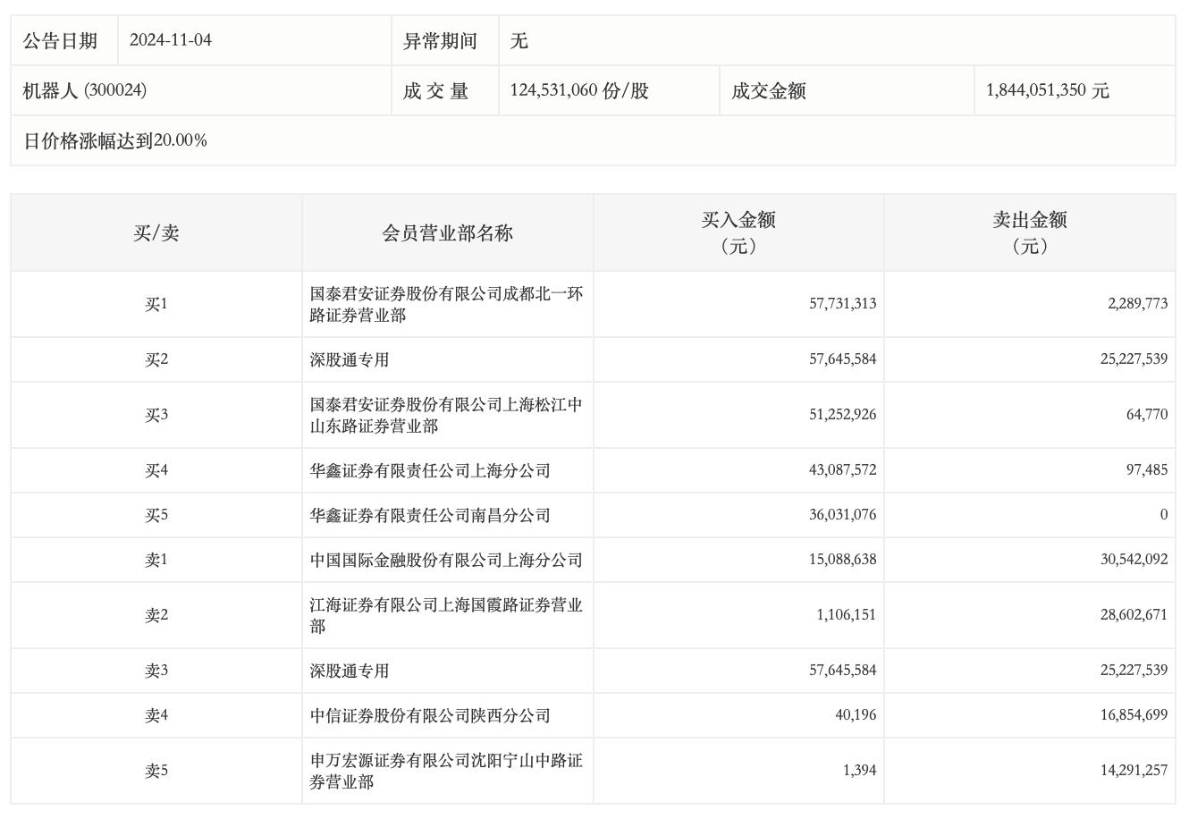 11月4日,机器人今日涨停,龙虎榜数据显示,上榜营业部席位全天成交3.8亿元,占当日总成交金额比例为20.6%。其中,买入金额为2.62亿元,卖出金额为1.18亿元,合计净买入1.44亿元。