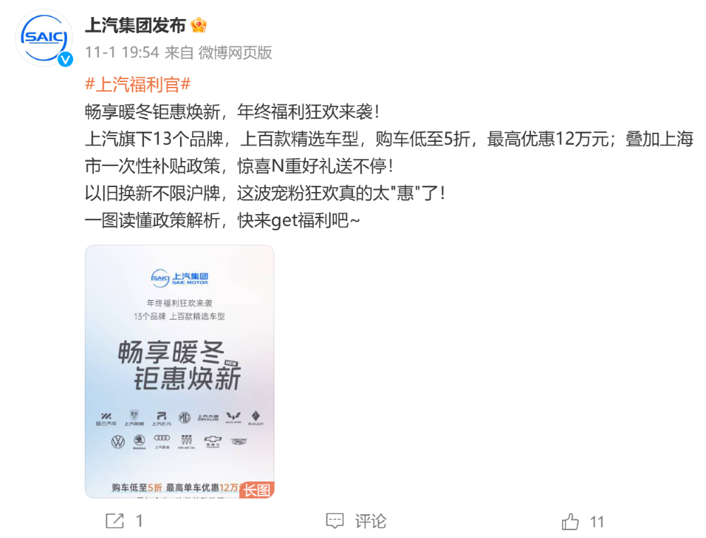 ▲上汽集团官宣开启优惠
