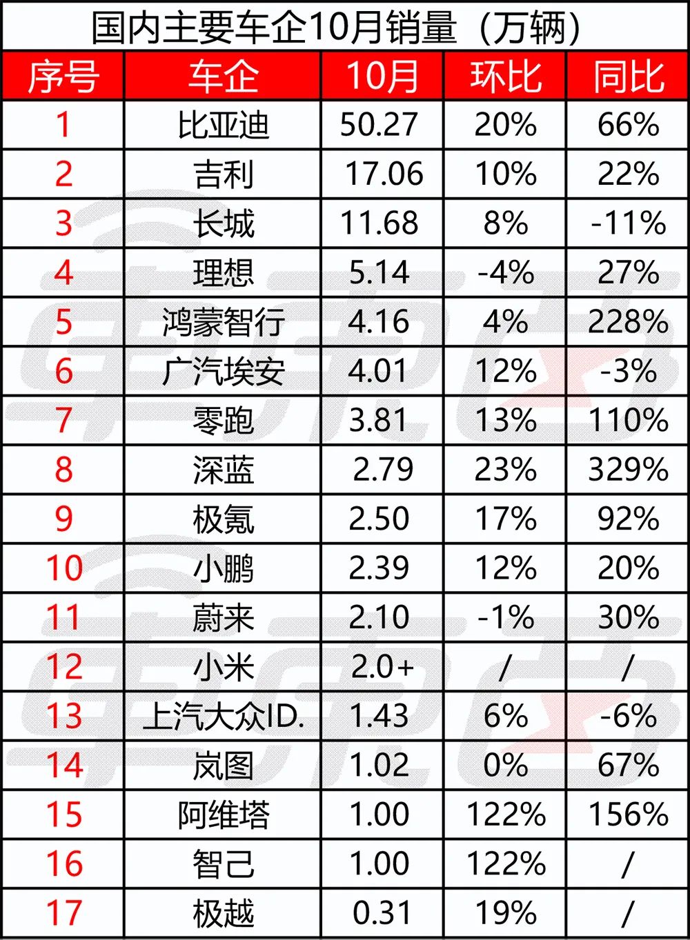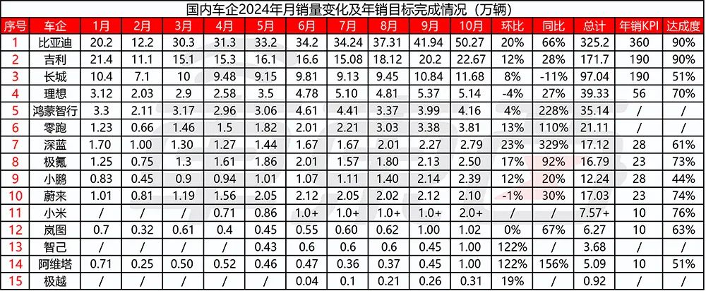 不仅如此,比亚迪、吉利、长城、零跑、深蓝、小鹏、小米、岚图、智己、阿维塔、极越共计11家车企在10月份也达到了销量新高。