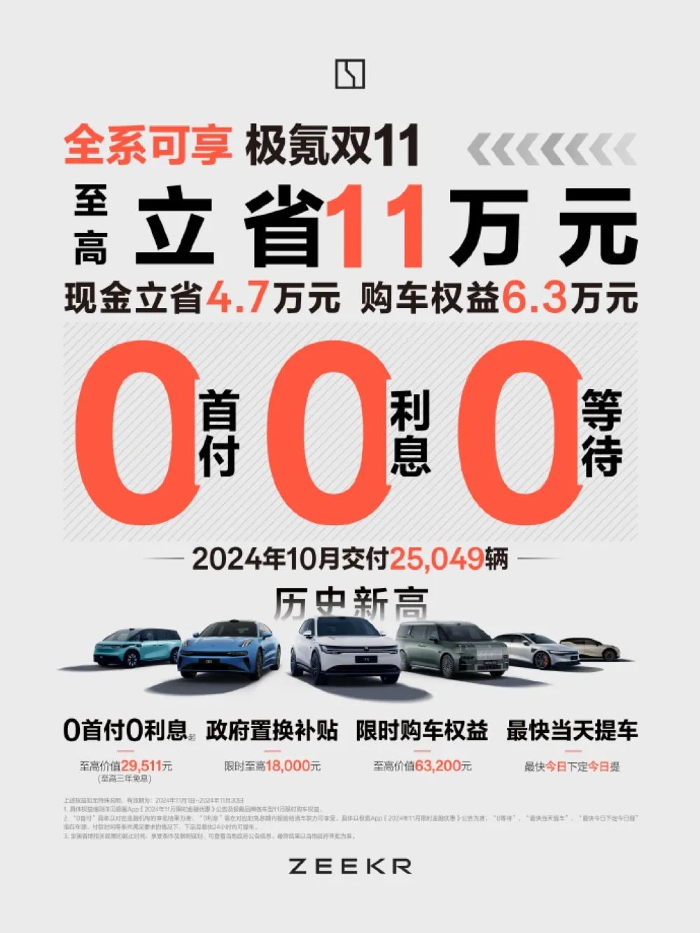 极氪也以借双十一活动的名号开启了优惠,表示全系车型0首付0利息0等待,至高立省11万元,其中也包括了政府置换补贴和限时购车权益等优惠政策,同时最快当天提车。