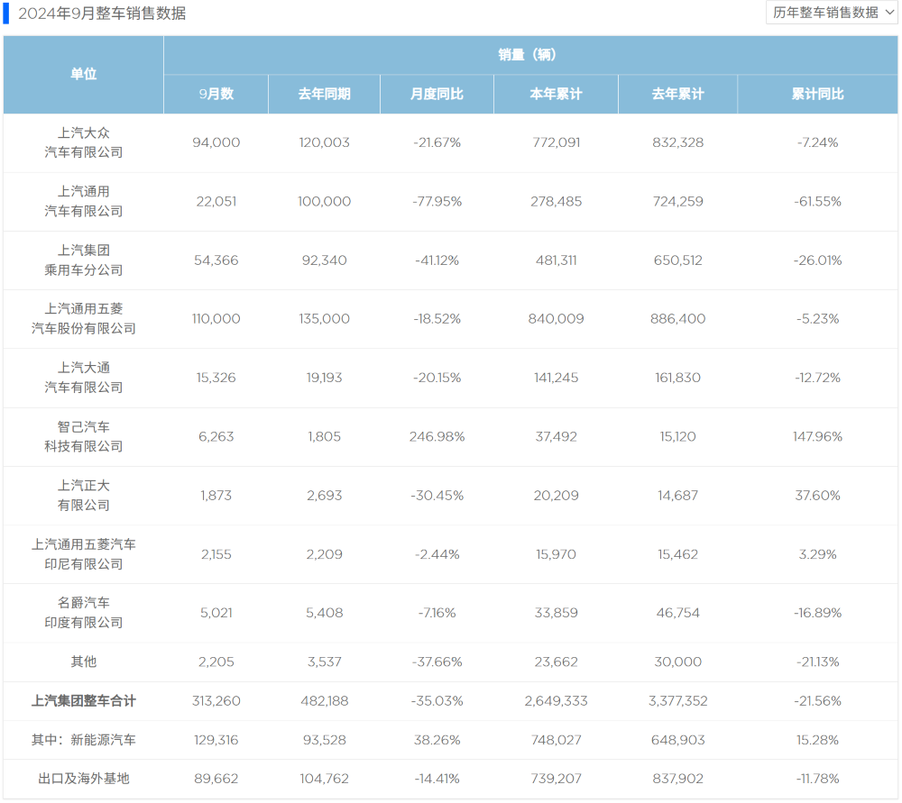 上汽集团还没有发布其全部品牌的10月份整车销售数据,但根据其2024年9月份整车销售数据来看,上汽集团9月销售新车31.3260万辆,同比下降了35.03%。