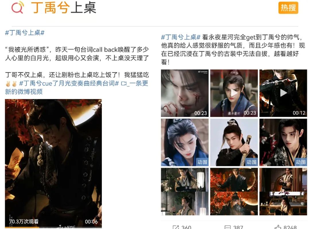 与此同时,曾经被网友所抵制的古偶男主丁禹兮,也因为在《永夜星河》里的妆造、人设变化,成功让网友喊出了#丁禹兮 上桌#的热一话题,足见古偶对于上升期演员的魔力。