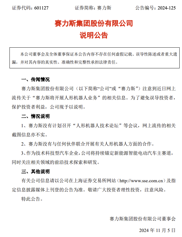 11月4日晚间,赛力斯公告,公司注意到近日网上流传关于“赛力斯将开展人形机器人业务”的相关信息。为了避免误导投资者,保护投资者利益,公司现予以说明:赛力斯没有计划召开“人形机器人技术论坛”等会议,网上流传的相关截图信息亦不实;赛力斯没有与任何伙伴联合开展有关人形机器人方面的合作;作为技术科技型汽车企业,公司将持续锚定新能源智能电动汽车主赛道,同时关注相关领域的前沿技术探索和研发。