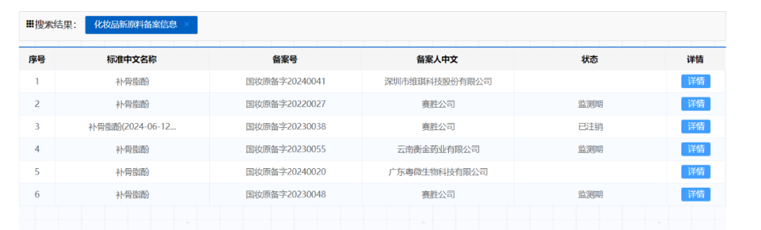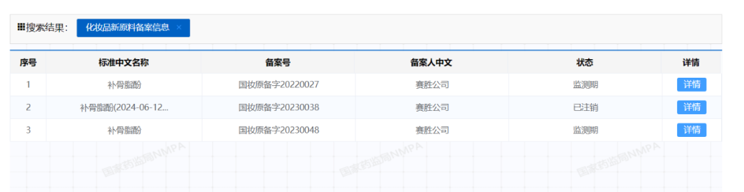 值得一提的是,赛胜公司的补骨脂酚原料不仅只限于海外市场。青眼了解到,2022年,赛胜公司在国家药监局成功备案了补骨脂酚,成为第一家在中国取得补骨脂酚新原料备案的美国公司。青眼从国家药监局官网查阅发现,赛胜公司目前已备案3款补骨脂酚原料,其中一款“已注销”,但另外两款仍处于监测期。