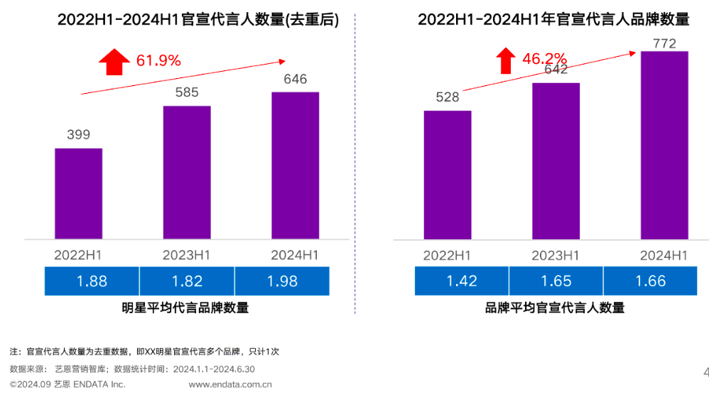 一方面明星代言市场在今年还挺火热的。2024年上半年,明星平均代言品牌数同比增长10.4%,比22年同期增长61.9%。另外,品牌平均官宣代言人数量同比增长了20%。