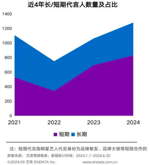 另一方面,从2021到2024年,短期代言人的数量呈现显著增长趋势,2024上半年明星短期代言数量已大幅超越往年。
