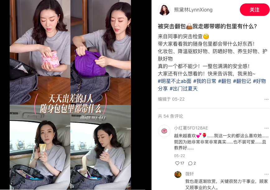 明星翻包视频就是,明星分享自己随身包里的产品,适用于护肤品、化妆品、食品等品类,本质上就是明星种草的一种形式。通过翻包视频,明星们展示了自己真实的生活状态,从而拉近与粉丝的距离,也借助这种轻松的推广方式,帮助品牌实现了有效种草。