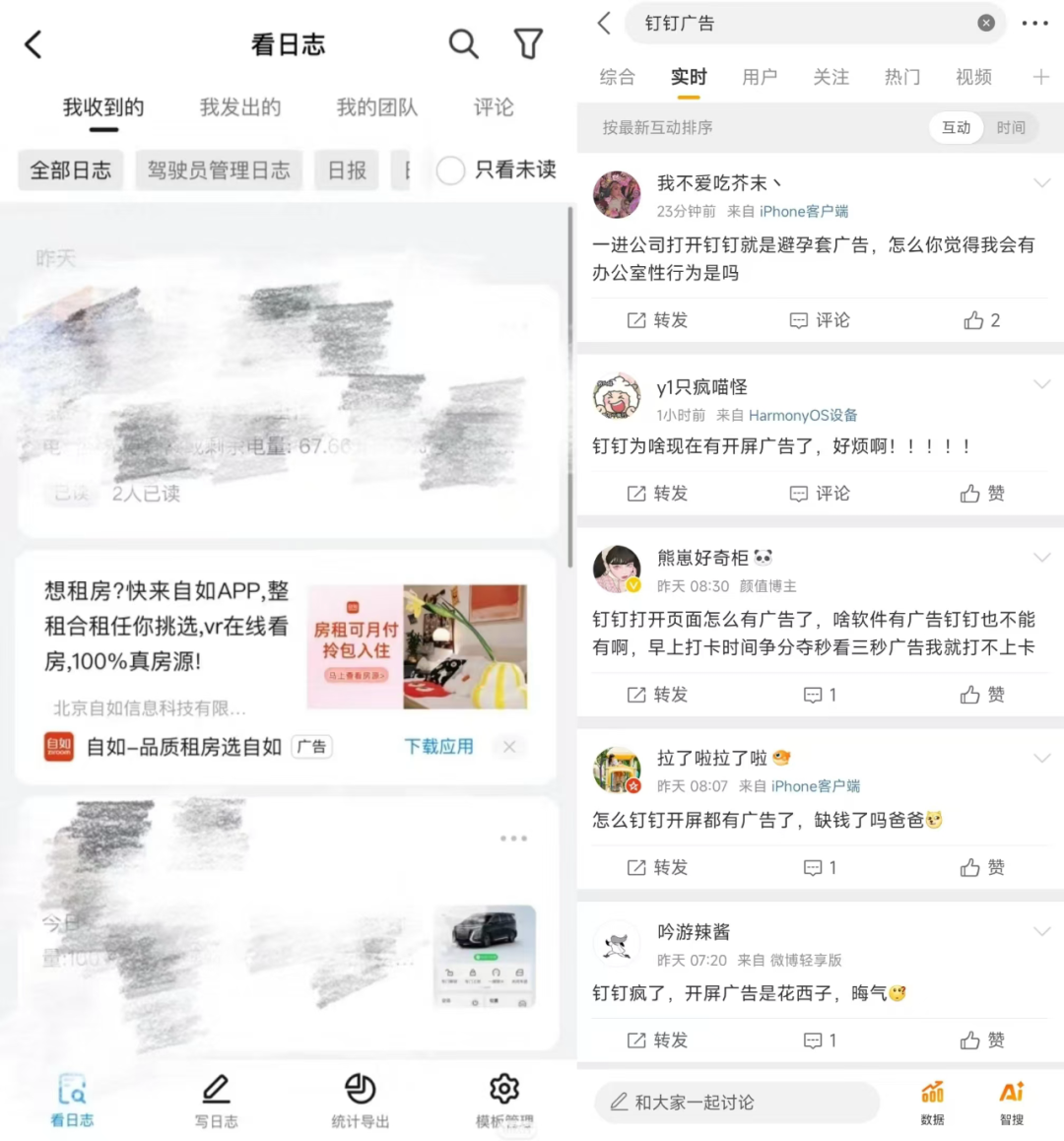 工作日志中的广告更是让打工人破防。“体验非常差,钉钉是有多缺钱,在我们内部审核流程中出先广告,烦死了。”另一位用户直言:“钉钉的吃相很难看,广告无孔不入,影响正常工作了。”