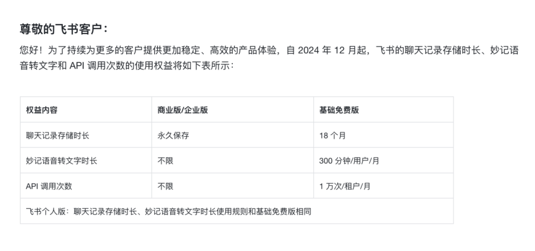 今年,飞书进一步调整了存储空间的使用规则,并在近期宣布限制语音转文字的时长:自2024年12月3日起,飞书免费版用户每月仅有300分钟的“妙记语音转文字”免费额度,而之前这一功能没有时长限制。
