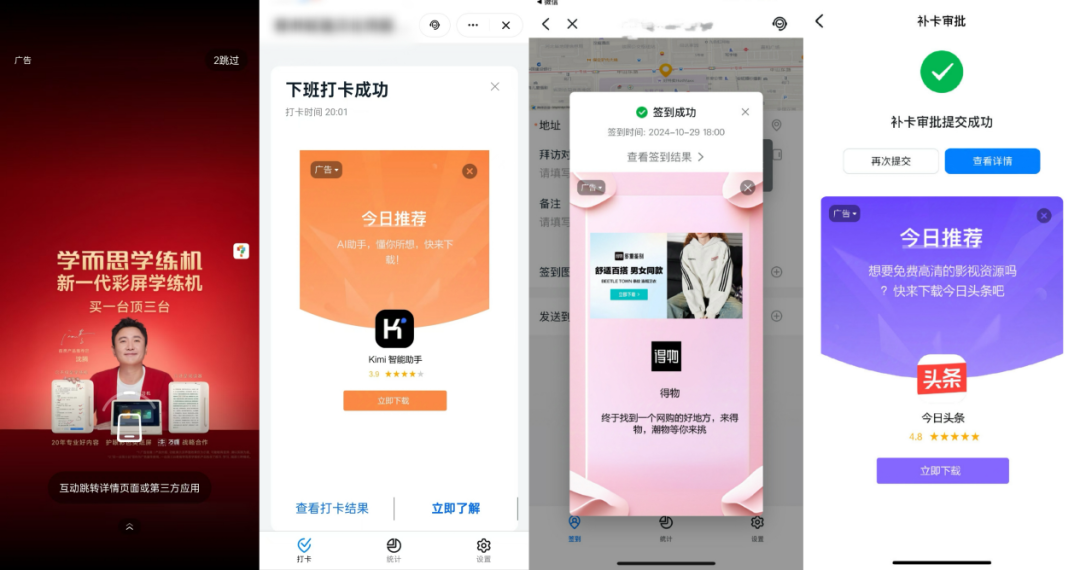 据「市象」观察,应用开屏广告外,从今年9月起,钉钉在下班打卡、签到、加班审批、工作日志、直播回放等多个环节密集植入营销广告,进一步激化了用户的不满,吐槽声持续攀升。