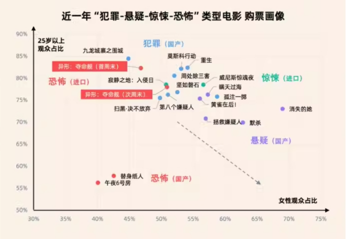 另外,很关键的一点是,无论海内外,恐怖片的受众画像都极为年轻,所以它是院线拉动年轻人观影的重要抓手之一。据灯塔《2024年暑期档电影市场洞察报告》,近一年“犯罪-悬疑-惊悚-恐怖”类型电影购票画像中,两部国产恐怖片的画像区间显示出极为显著的年轻化。