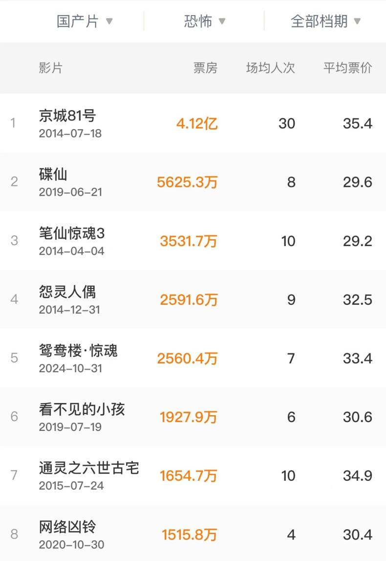 然而,国产恐怖片过去的高光时刻仍历历在目。不论是收获4.12亿票房,大大拉升该类型票房天花板的《京城81号》,还是为影迷群体所称道,被视作国产恐怖片崛起希望的《中邪》,都是在各自的方向上曾经给予从业者以振奋的案例。
