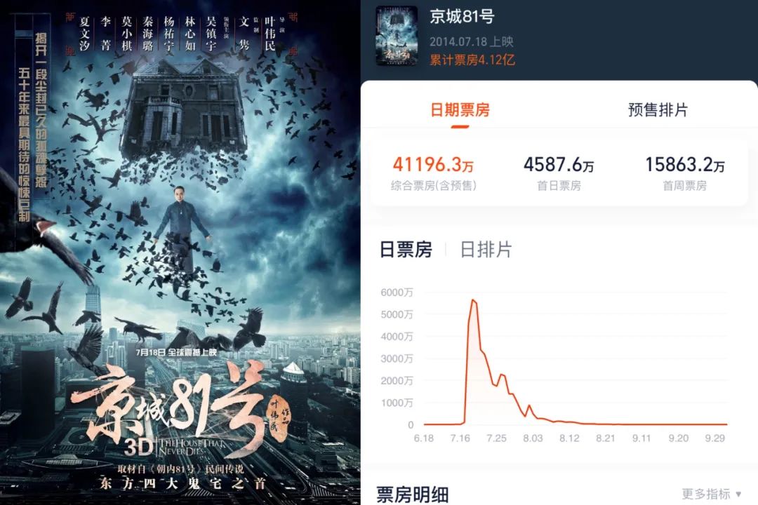 项目策划上自然有不少可取之处,“朝内81号”之前就是由来已久的坊间传说,号称“四大鬼宅”之首,其民间影响力也抵得上一个“IP”之名。加之在此之前的恐怖片往往以超小成本制作,并不会引入一系列知名度较高的演员,但《京城81号》找来了吴镇宇、林心如、杨祐宁等人主演,从片酬上拉高了制作水位。恰逢彼时吴镇宇刚上《爸爸去哪儿》,综艺人气火爆,林心如因此前参演过叶伟民导演的《绣花鞋》,在民间有“鬼后”之称,进一步提高了卡司的吸引力。与此同时,它还号称国内首部3D恐怖大片,彼时的3D还没成为市场的滥觞,恐怖片又是极度强调沉浸感的类型,3D恐怖片的噱头不可谓不足。再加上当时同档期竞争对手的疲软,共同促成了4.12亿的票房奇迹。