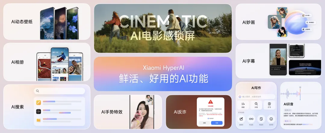 小米15不仅搭载了澎湃OS 2操作系统,还具备一系列AI功能。具体来看,小米澎湃OS 2支持AI动态壁纸、AI“电影感”锁屏、AI写作、AI识音、AI字幕、AI妙画等功能。