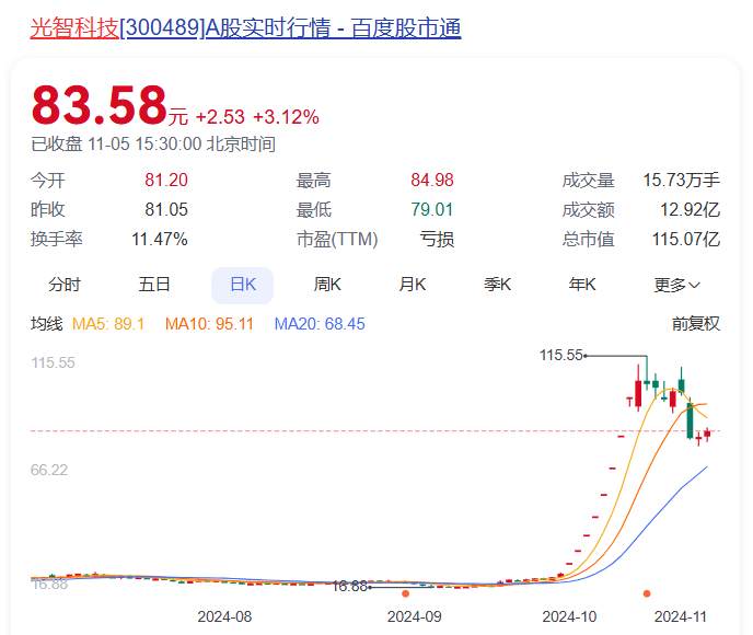 11月5日该股票微涨3.12%,报83.58元/股,市值达115亿元。