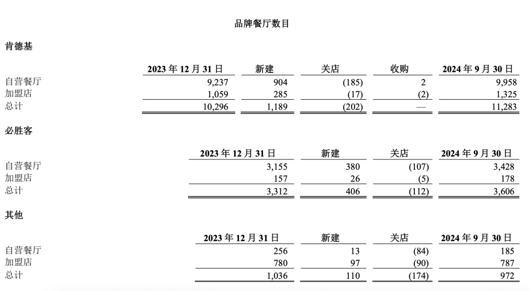 2024年前九个月,肯德基、必胜客净新增的加盟店分别有266家、21家,截至9月30日的加盟店总数分别为1325、178。