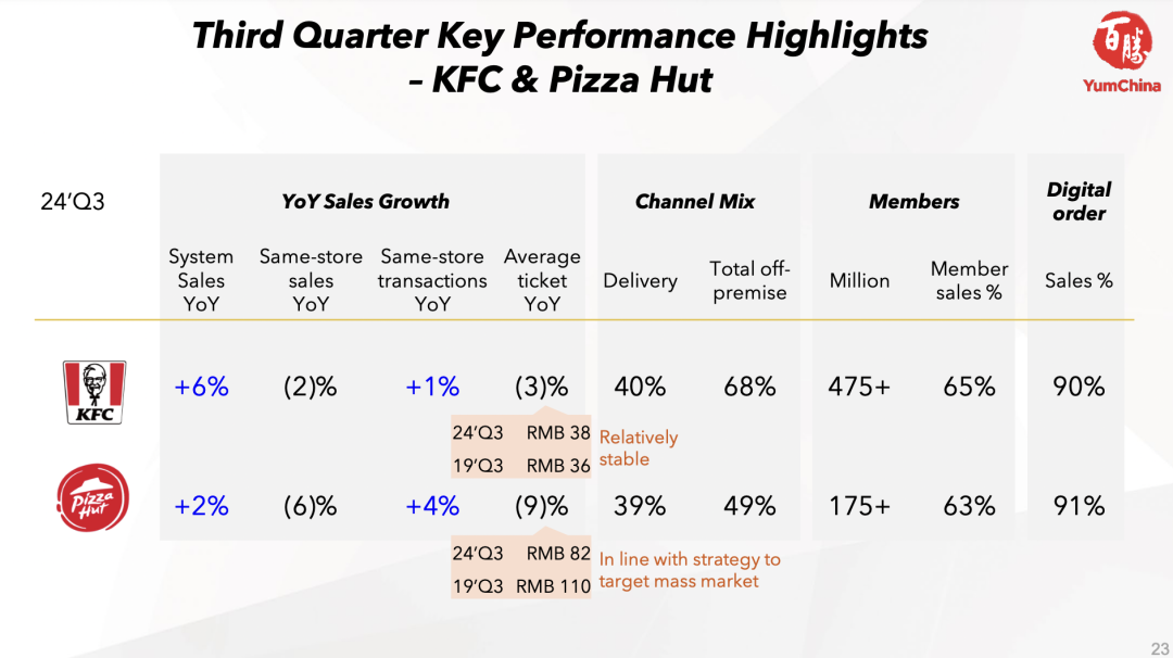 聚焦两大品牌,肯德基当季同店销售额同比下滑2%,交易量上升1%,平均客单价下降3%。必胜客同店销售额同比下滑6%,交易量上升4%,平均客单价下降9%。