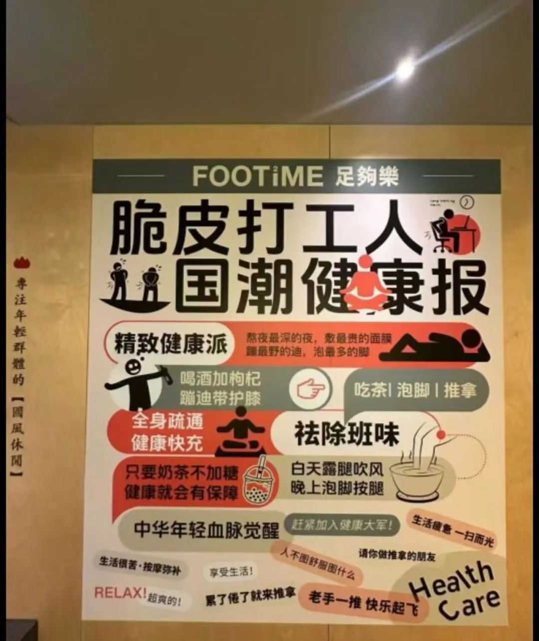 小米还表示,冬天到了,逛公园有些冷,她看到很多新中式推拿店都设有读书区、放空区、文创墙等空间,很多年轻人边看漫画边泡脚,还有学生来店“上自习”。她已经和朋友相约,要每隔一段时间就找一家不同的新中式推拿店打卡。