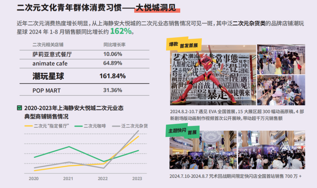 此外,在品牌推介会同日发布的《2024大悦城青年文化白皮书》中还透露了其他数据,呈现出二次元消费热度的高涨。2024年1-8月之间,静安大悦城中泛二次元杂货类品牌店铺潮玩星球的销售额同比增长了162%,日本知名动漫主题咖啡品牌animate café销售额同比增长64.89%,远超萨莉亚餐厅、泡泡玛特这样的非二次元业态。