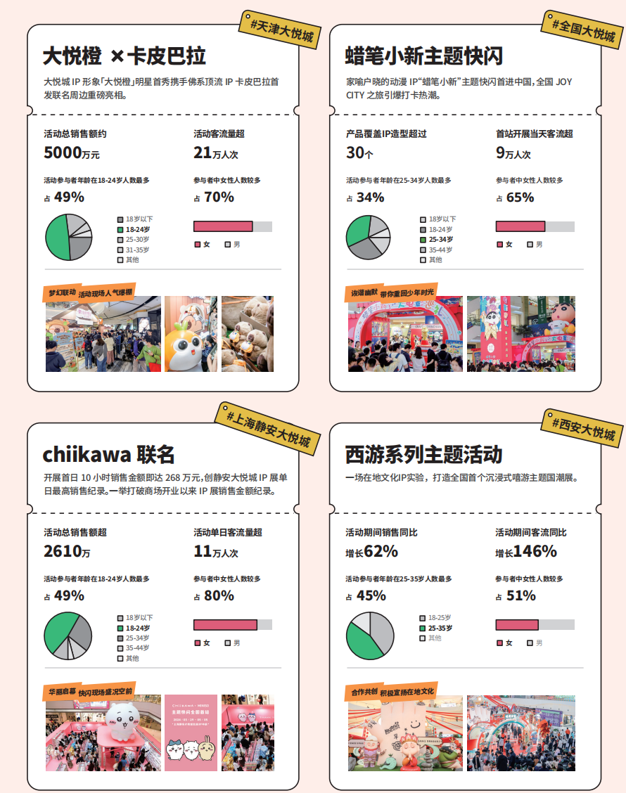 在大悦城的二次元业态中,活动快闪类店铺更是以不到10%的店铺数量贡献了超过半数的热度。例如,今年7月10日-8月7日在上海静安大悦城举办的咒术回战期间限定快闪全国首站销售额突破了700万。今年五一前后,大悦城 IP 形象「大悦橙」明星首秀携手佛系顶流 IP 卡皮巴拉首发联名周边在天津大悦城重磅亮相,活动总销售额破5000万元,总客流超21万人次。今年3月29日,上海静安大悦城举办的chiikawa x miniso主题快闪全国首站首日10小时销售金额即达268万元,创上海静安大悦城IP展单日最高销售纪录,活动总销售额超2610万元。