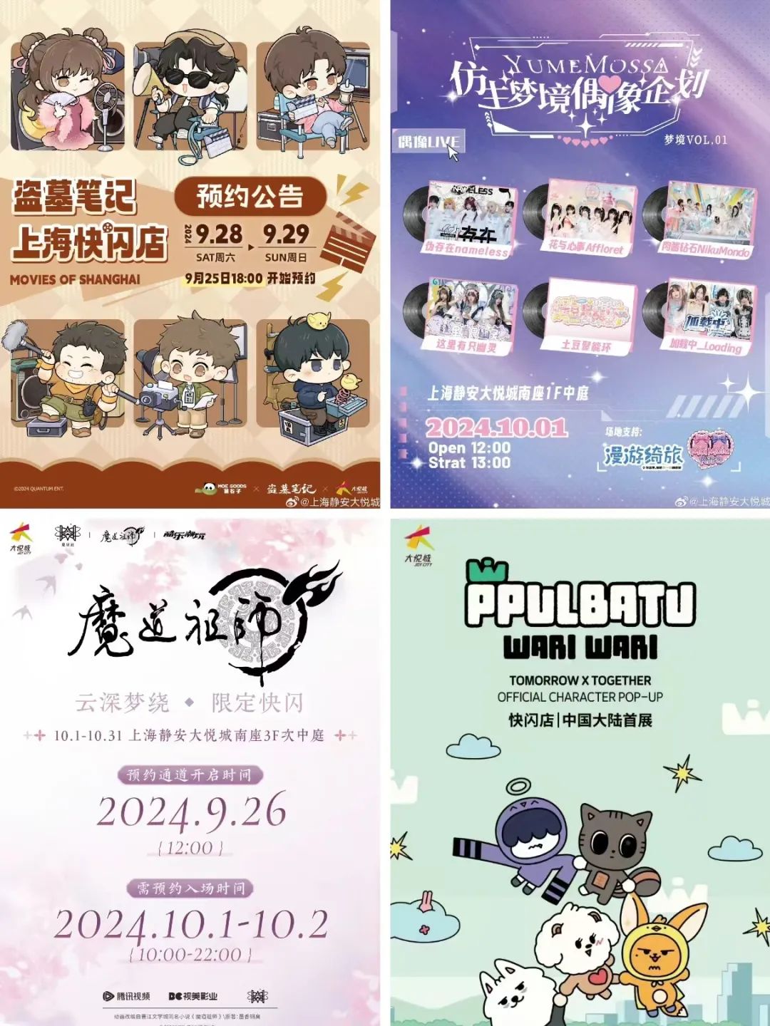 例如,今年国庆期间,上海静安大悦城携手小红书二次元官方,打造了首个“次元旅人”化妆间,并推出“盗墓笔记上海快闪”、“魔道祖师动画云深梦绕限定快闪”、“光与夜之恋x线条小狗线条大作战主题快闪”、“芙莉莲期间限定快闪”、“遇见EVA全国首展”等多个二次元快闪活动,吸引了大量年轻客群,七天快闪活动总体销售近1000万元。静安大悦城国庆期间总客流突破70万人次,同比增长超28.5%;总销售近6500万元,同比提升约20%。其中10月2日,客流突破11.5万人次,同比提升超40%,再度刷新商场单日客流最高纪录。