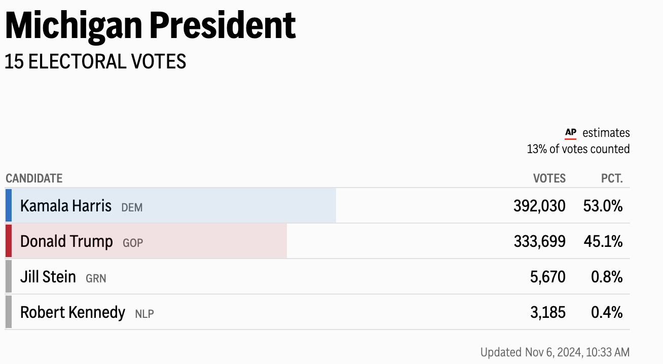 美国大选中,拥有15张选举人票的关键摇摆州密歇根州的投票即将结束。截至发稿,13%的选票已被计入,美联社统计显示哈里斯在该州暂时领先,得票率为53.0%,特朗普得票率45.1%。