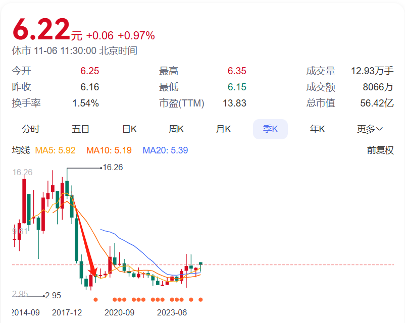 截至11月5日午盘,康尼机电股价微涨0.97%,报6.22元/股,市值为56亿元。