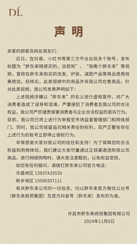 11月6日,胖东来发布声明称,近日,第三方平台出现多个账号发布视频,宣称在胖东来购买的洗发、护肤、减肥产品等商品使用效果绝佳。经核实,此类视频中的商品并非本公司在售商品。上述视频涉嫌以“胖东来”的名义进行虚假宣传,对广大消费者造成了误导和混淆,严重侵犯了消费者及本公司的合法权益。目前,公司已将上述行为举报至市场监督管理部门和网信部门。同时,公司保留追究相关责任的权利,现严正警告存在上述行为的账号立即停止侵权行为。