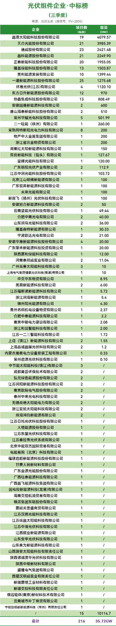 央企作为光伏组件招投标市场的绝对主力,无论招标规模还是设备要求均有指标性意义。在央企项目光伏组件企业中标榜(三季度)中,以五大六小、两网、两建为代表的央企定标组件项目约144个,共有64家企业上榜,其中国晟科技在央企项目的中标容量位列榜单第8位!
