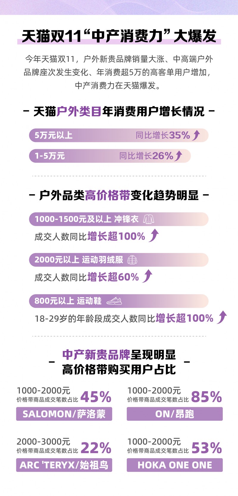 今年天猫双11,“户外新贵”们迎来新机——“户外新贵”品牌销量大涨、中高端户外品牌排名发生变化、年消费超5万的高客单用户增加……