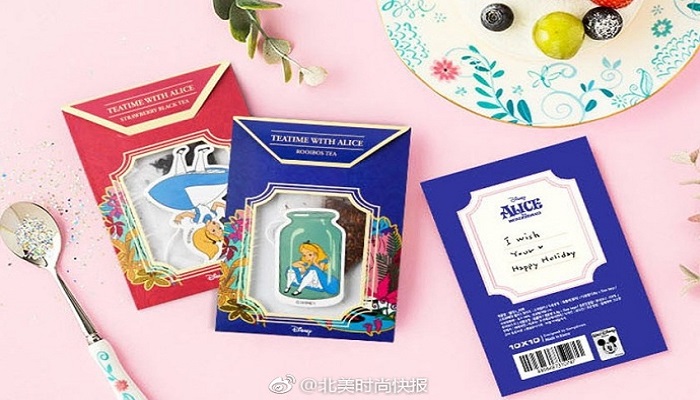 迪士尼推出《爱丽丝梦游仙境》为主题的茶包,分为南非茶和草莓红茶两种口味,包装包括5种不同造型,有爱丽丝,妙妙猫,红心女王还有白兔先生,疯狂少女心的梦幻茶包让下午茶充满乐趣。