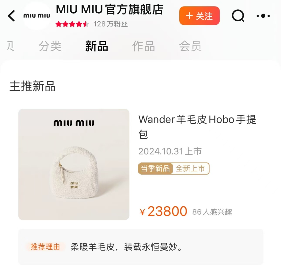 出身高奢集团的Miu Miu比其他新品牌冒头更容易,享有更多资源,但其定价却不像其他传统老牌奢牌那样高高在上。根据官网售价,Miu Miu的产品价格从200元到40000元左右不等,其中,手包大概在7000元-30000元价格带,成衣大概在5000元-40000元价格带。