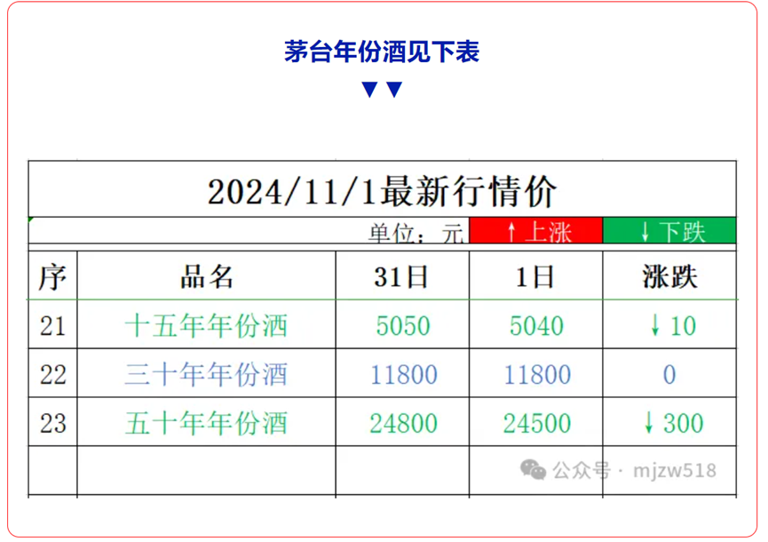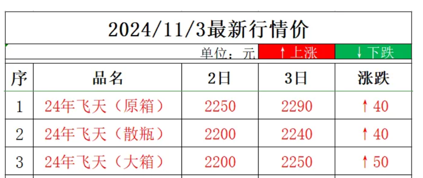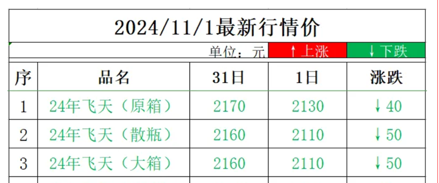 根据“名酒线报”公布的当日茅台行情价,2024年飞天茅台原箱和散瓶的零售价分别跌至2130元/瓶和2110元/瓶。