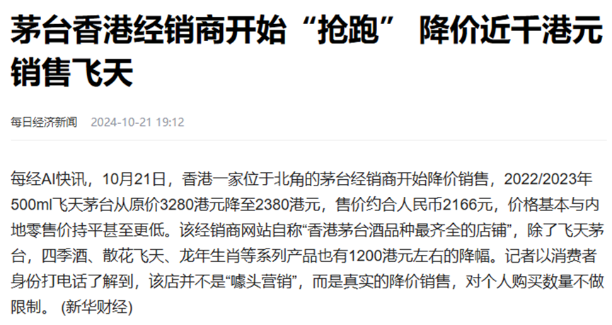近期亦有媒体报道,茅台香港某经销商降价近千港元,抛售飞天茅台。