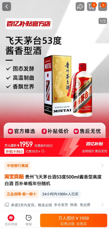 11月1日,“百亿补贴”之下,几家电商平台的飞天茅台跌破2000元大关,个别价格打到了1959元/瓶。