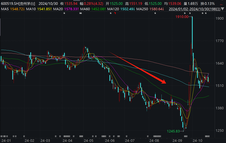 也是从张德芹履新一把手的5月开始,茅台股价从1700元/股附近,跌到9月最低点1245.83元/股。