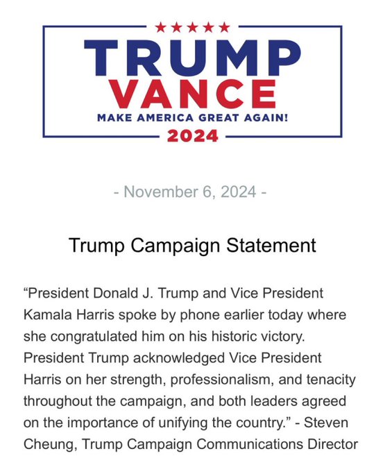 当地时间11月6日,特朗普竞选团队发表声明称,当天早些时候,特朗普与哈里斯通话,哈里斯祝贺特朗普取得历史性胜利。特朗普对哈里斯在整个竞选过程中表现出的实力、专业精神和韧性表示认可,两位领导人就国家团结的重要性达成了共识。