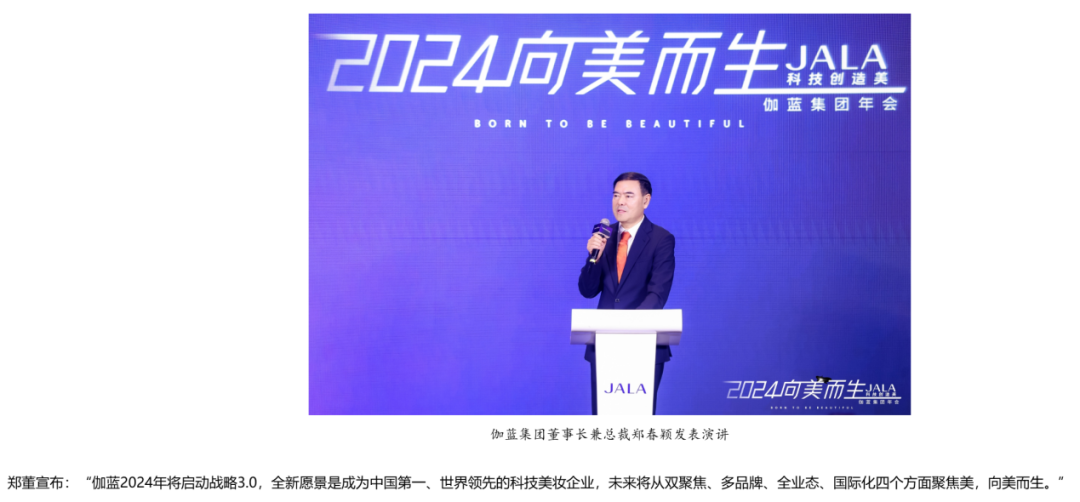 在去年底举办的2023年客户年会上,伽蓝集团(现已更名为“自然堂集团”)董事长郑春颖宣布2024年将启动战略3.0,全新愿景是成为中国第一、世界领先的科技美妆企业。