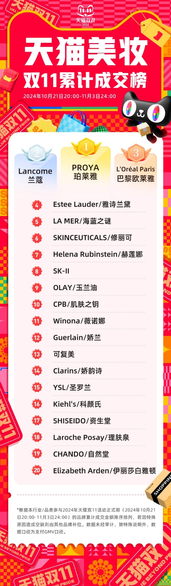 根据天猫公布的双11美妆累计成交榜单(10月21日20:00-11月3日24:00),珀莱雅没有意外依然保持第一。