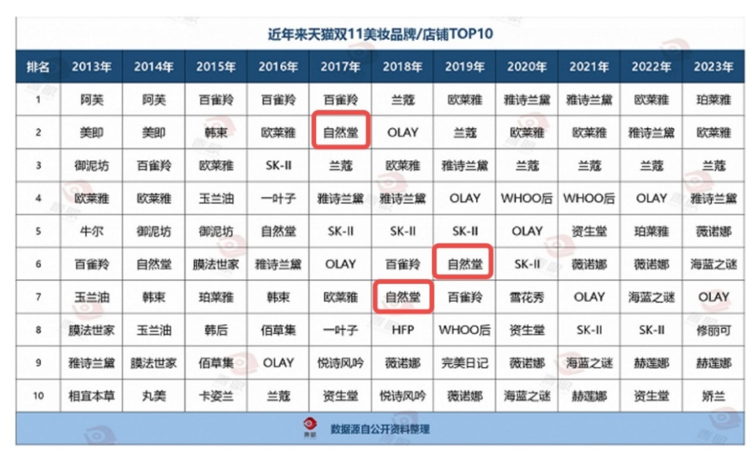 这些榜单中,无一例外,都没有自然堂。然而,早在2018年左右,自然堂还是天猫双11美妆榜单的常客,即使是当时的珀莱雅,大促中也不是自然堂的对手。