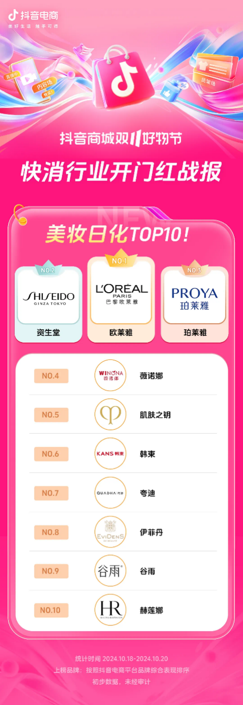 而抖音发布的双11正式期前三天(10月18日-10月20日)成绩单,美妆日化榜单前10名中,国货品牌珀莱雅、薇诺娜、韩束、夸迪、谷雨占据5席。