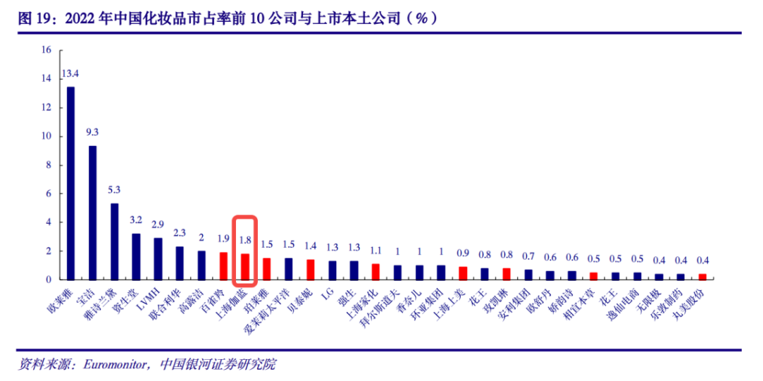 据中国银河证券数据,2018年-2022年,自然堂集团(原伽蓝集团)市场份额从2.3%下滑至1.8%。