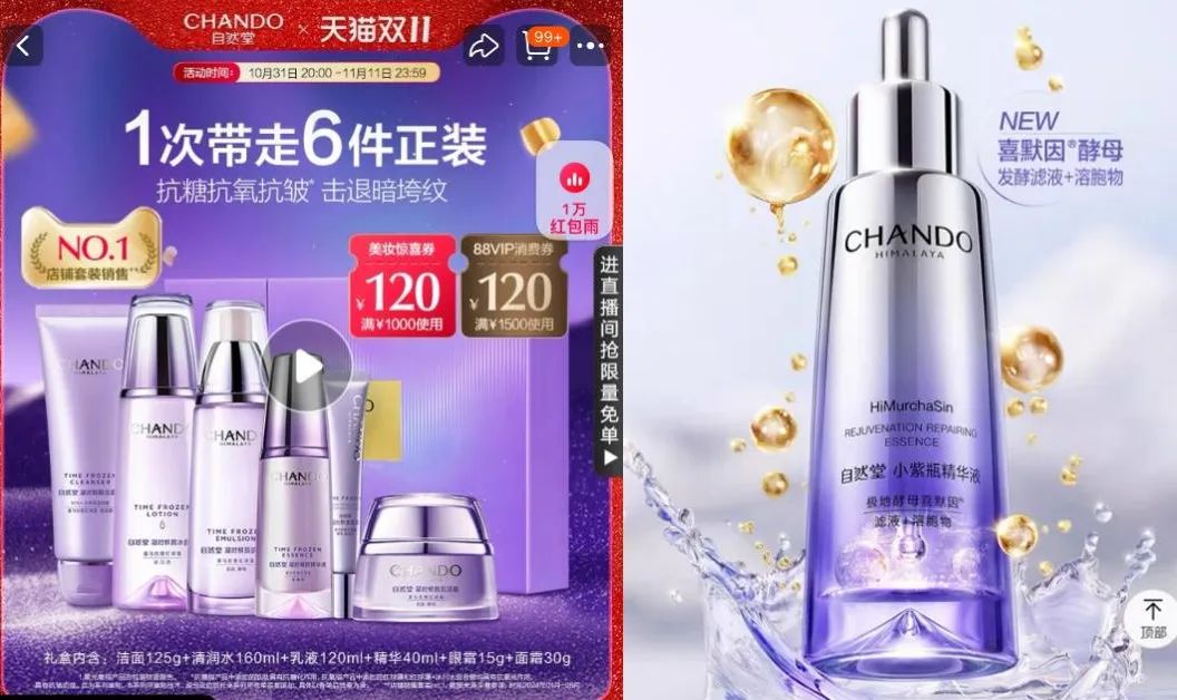 图 / 自然堂凝时紧致系列(左)自然堂第六代小紫瓶精华(右)