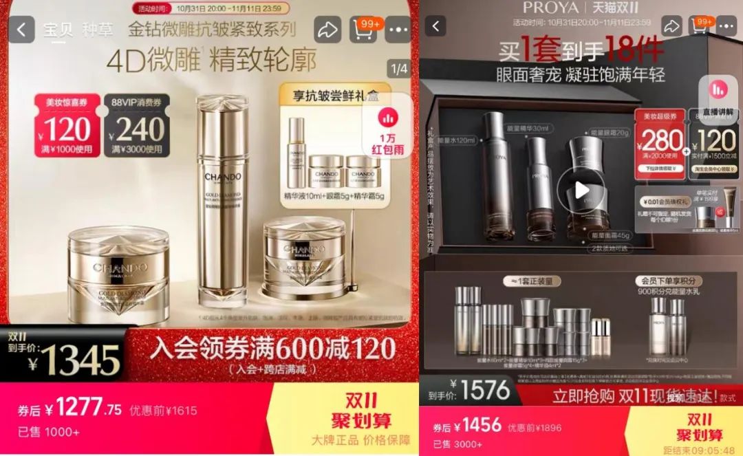 以天猫旗舰店高端线套装为例,双11期间,自然堂微雕系列套盒售价1277元左右,包括精华、面霜、眼霜三个正装,以及三个尝鲜装小样。