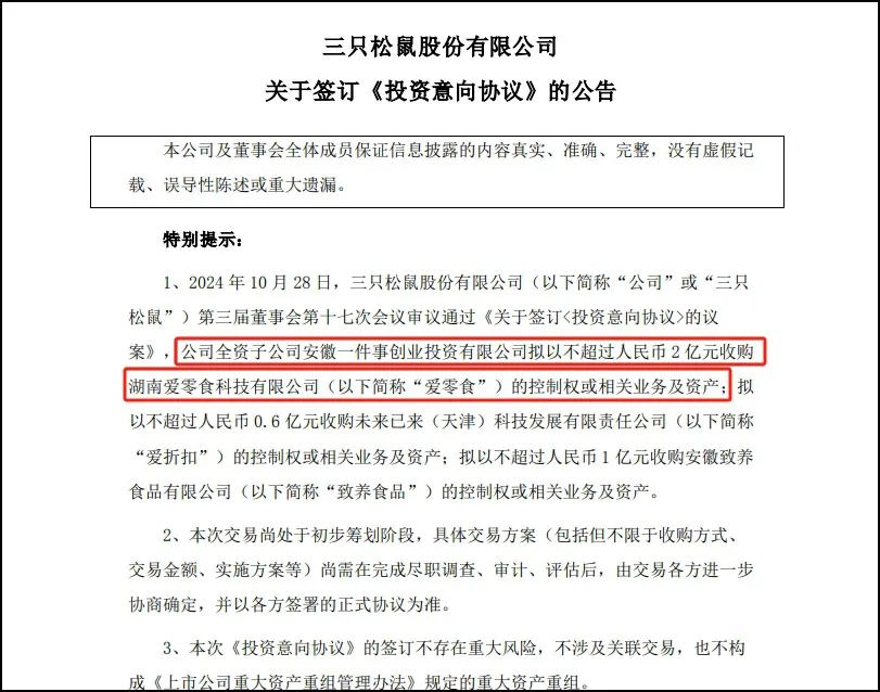 10月28日,三只松鼠连发三文件,分别宣布公司将以合计不超过3.6亿元收购爱零食、爱折扣和致养食品三家品牌,投资不超过1亿元孵化超大腕、蜻蜓教练等新子品牌,以及投资不超过2亿元进一步完善建设芜湖、天津和简阳等供应链集约基地。